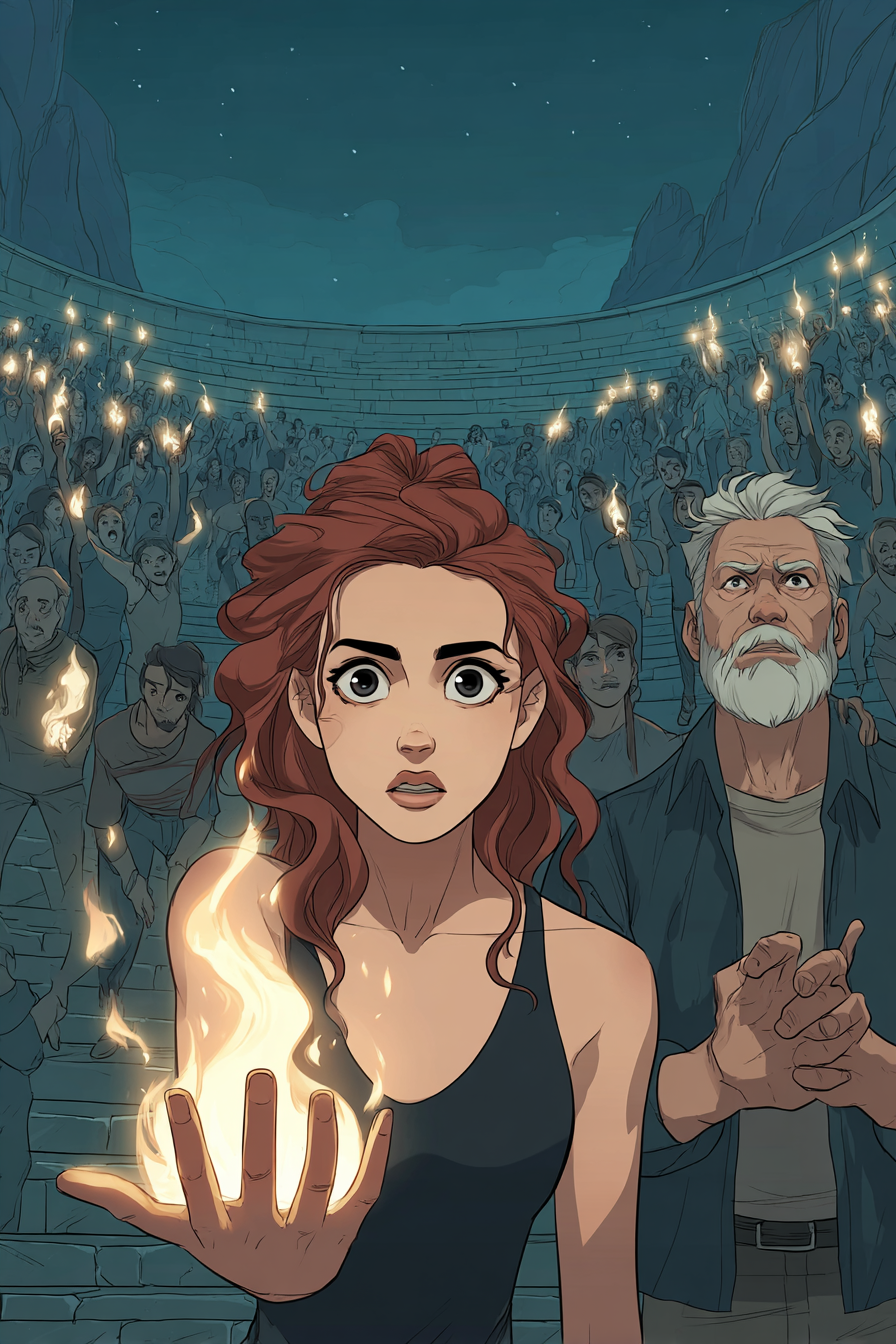 The battle at the amphitheatre erupts in chaos: Seth in Phoenix-metal armour, Geraldine bellowing her full name like a war cry, Dante descending as a Storm Dragon. Orion kills Clara — not as an act of cruelty, but to free his sister's soul; her last breath is a release. Lavinia reforms in her true body, black hair and red eyes, more powerful than she has ever been, and curses Darcy with a shadow handprint burned into her arm before they can stop her.